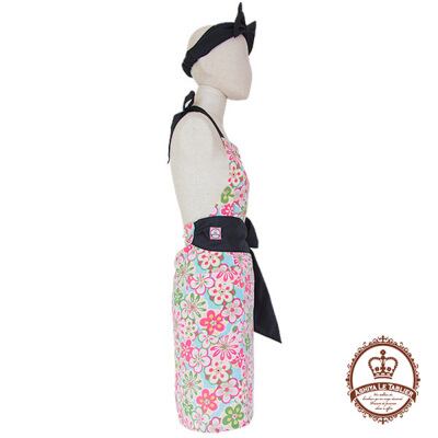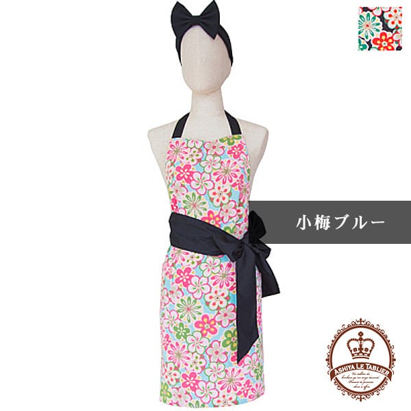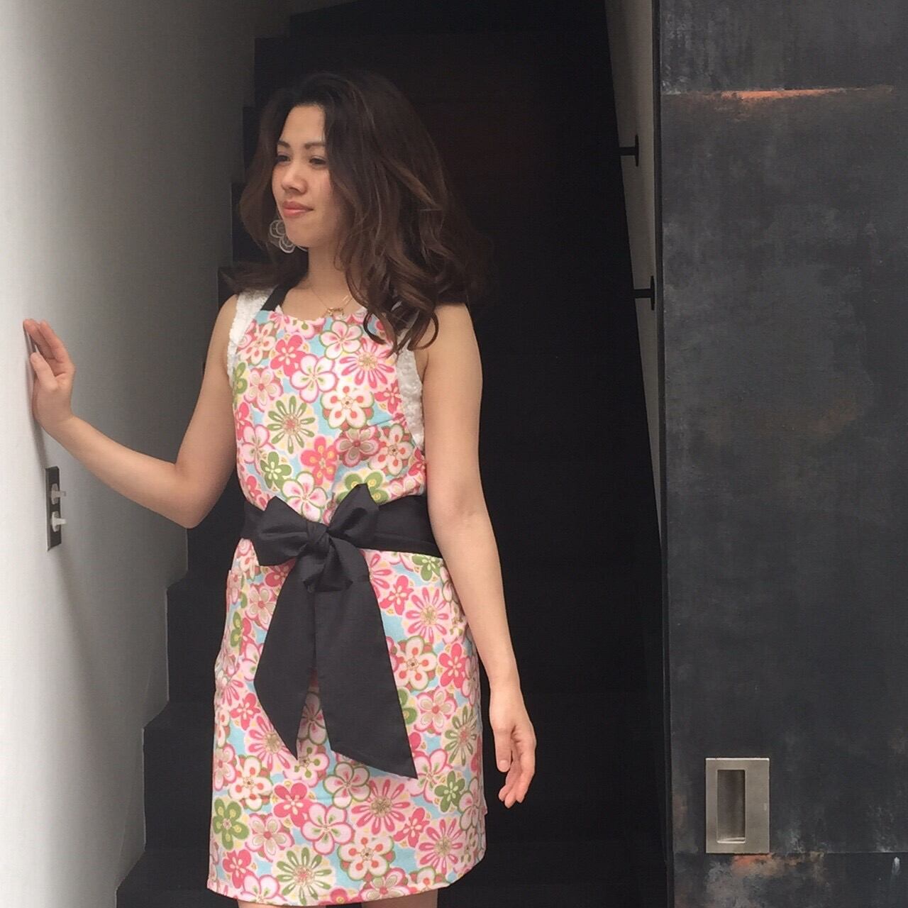 和の香りがほんのり漂うちりめん生地に、ウエストで結ぶブラックのリボンが小粋に引き締めてくれます。髪をアップにしたときの、ネックで結んだリボンとヒップを包み込むスタイルは、後姿をキュートに見せてくれます。女性に嬉しいアイロンいらずで、お手入れの楽なエプロンです。